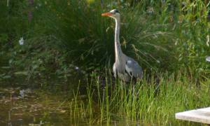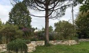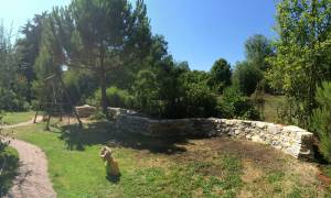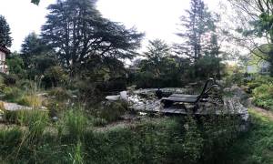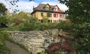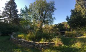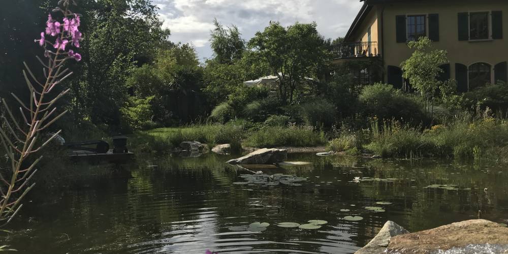 Un jardin bio avec un étang entouré d'un mur en pierre naturelle taillée et une prairie de flore suisse. Dans notre jardin on peux y trouver héron, divers oiseaux, hérissons, lézards, tritons, crapauds, libellules.