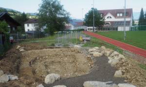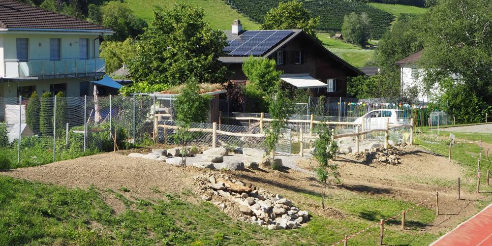 Auf dem Pausenplatz sind verschiedene Strukturen entstanden. Ein Weiher, Totholz, Stehlinsen, Sträucher und viele wertvolle kleinere Lebensräume haben zu mehr Biodiversität auf dem Areal geführt.
